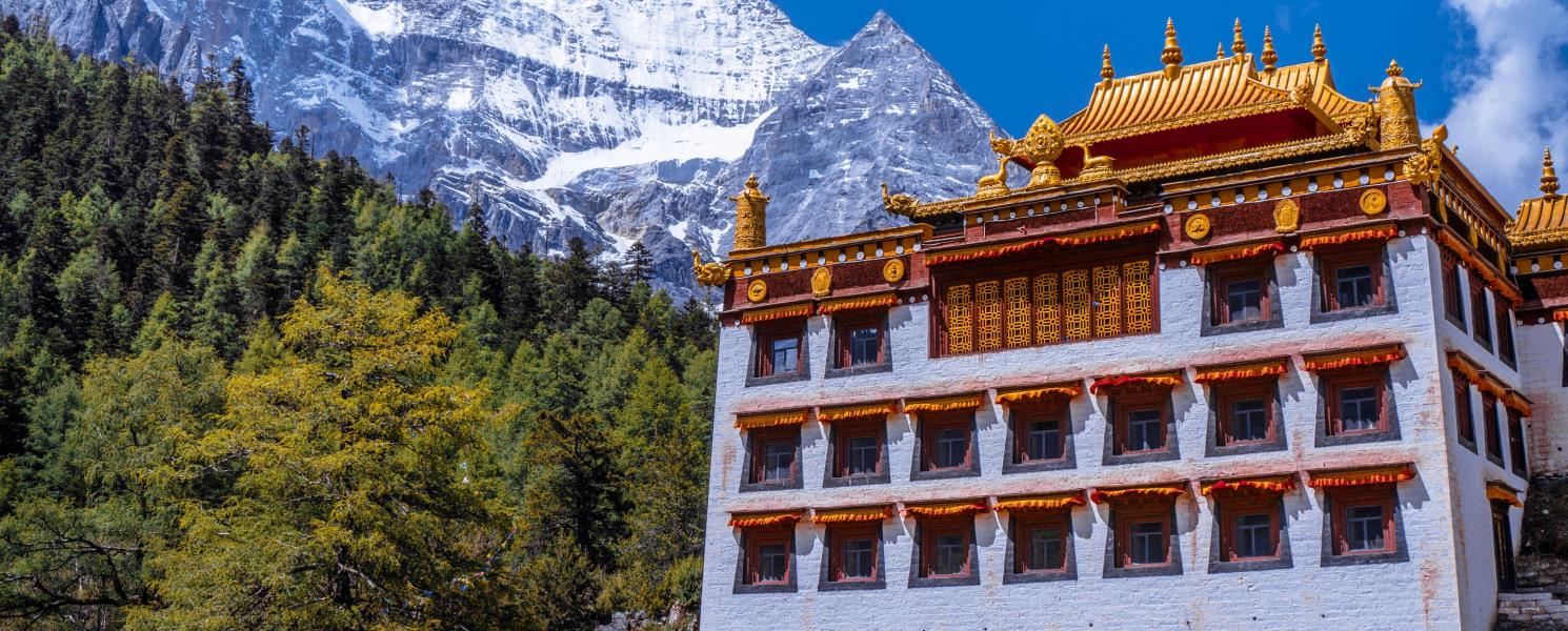 沖古寺坐落於稻城亞丁自然保護區內,背靠險峻峽谷,面向草甸與雪峰,環境清幽。寺名在藏語中意為「湖泊下的寺廟」,周圍遍布瑪尼堆與經幡,承載著藏民的祈願,寺院隸屬貢嘎郎吉嶺寺,香火鼎盛,是藏族信眾轉山儀式的起點。沖古寺不僅是宗教聖地,也是必訪的觀景平台,站在寺前可同時遠眺仙乃日、央邁勇與夏諾多吉三大神山,感受自然與信仰交融的莊嚴氛圍。