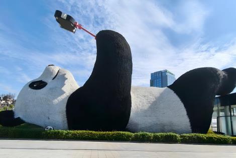 在仰天窩廣場上,有隻全球最大、130噸重的「自拍熊貓」,由世界級公共藝術公司U.P.A與黃色小鴨作者佛洛倫泰因·霍夫曼聯手打造,這隻熊貓圓滾滾地躺在草坪上,翹著腿舉自拍棒,呆萌又安逸,簡直是「成都生活態度」的最佳寫照。