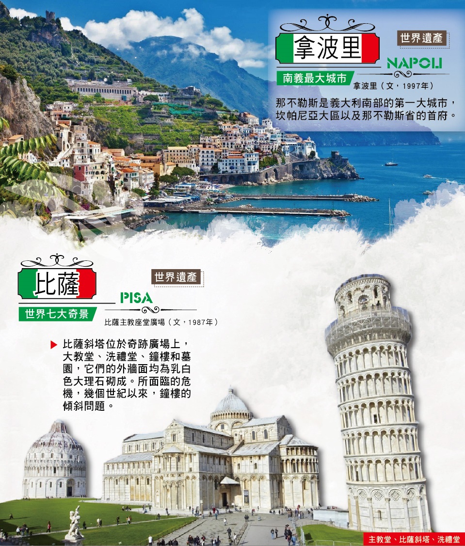 南北狹長像靴子一樣的義大利,曾是羅馬帝國的發源所在地,在政治、藝術和建築上皆為後代留下不少豐功偉業。中古世紀時的文藝復興在此萌芽,米開朗基羅等大師在此地留下相當多的藝術瑰寶。