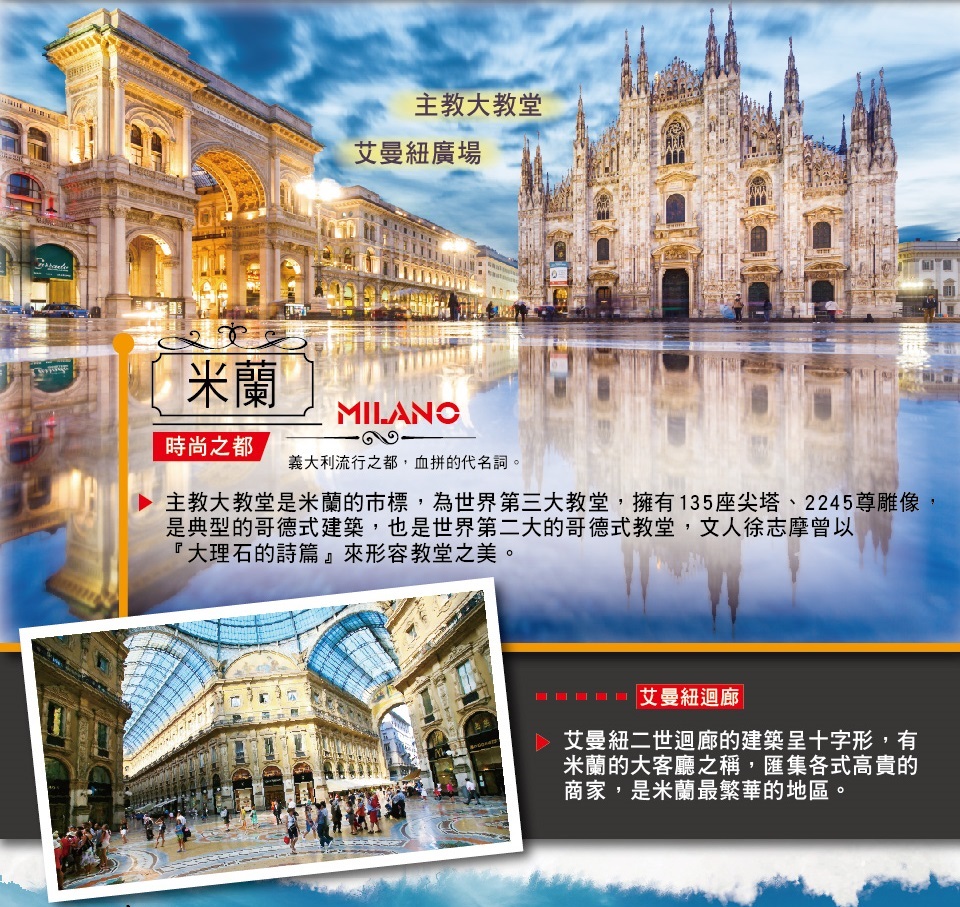 接著我們迎向流行之都~米蘭,享受藝術與時尚的洗禮。主教大教堂是米蘭的市標,為世界第三大教堂,擁有135座尖塔、2245尊雕像,是典型的哥德式建築,也是世界第二大的哥德式教堂,文人徐志摩曾以『大理石的詩篇』來形容教堂之美。艾曼紐二世迴廊的建築呈十字形,有米蘭的大客廳之稱,匯集各式高貴的商家,是米蘭最繁華的地區。密集的購物圈幾乎是絕無僅有的,這裡是引領時尚的流行神殿,也是名牌時尚的旗艦,當然更是名牌的重鎮。傍晚出發前往威尼斯。