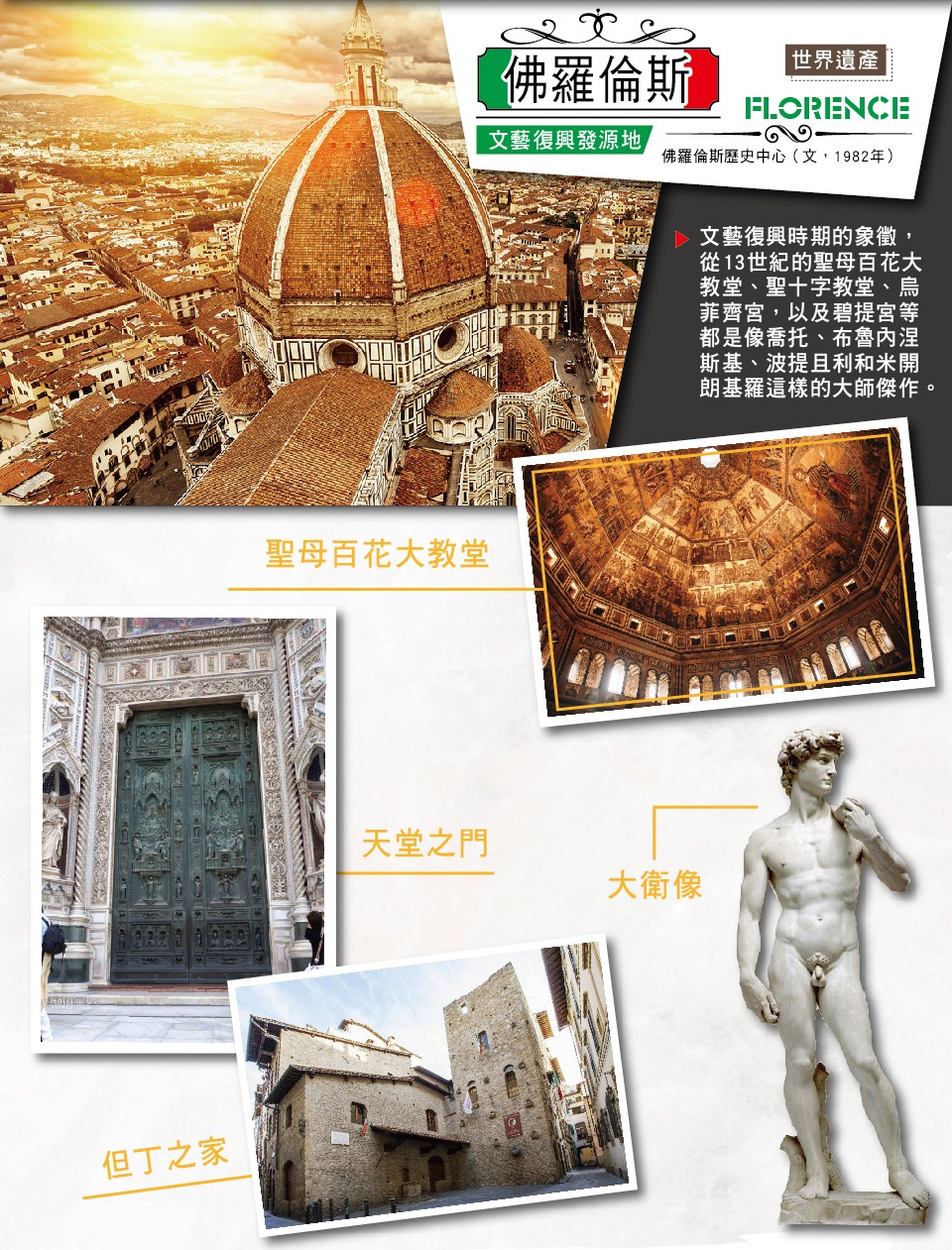 「梅迪奇家族」統治佛羅倫斯三百年,並贊助藝術家豐彩了文藝復興時代的光芒,「美麗,總有緣起!藝術,也有開端!」謙虛地回到您可靜靜地立足觀看中世紀最偉大的情緒感動,市政廳廣場上的大衛像遙望著旅人匆忙的心情,數百年來的喧擾人潮於眼前掠過!聖母百花教堂(Cattedrale di Santa Maria del Fiore)是佛羅倫斯的地標性建築. 其磚紅色的圓頂不僅造型優美,建造圓頂所使用的工法技術更是卓越!