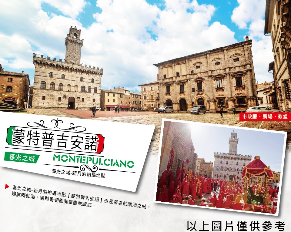 隨後,專車前往暮光之城─新月的拍攝地點【蒙特普吉安諾】,這座中世紀和文藝復興風格的山城海拔605公尺,位於高高的石灰岩山脊上,延著山城蜿蜒的石板路,回憶起電影中各個大小場景,此地同時也是著名的托斯卡尼釀酒之城,不但有14世紀建造的酒窖,更可以在許多酒鋪試喝紅酒,或步行到城牆邊、將葡萄園美景盡收眼底。
