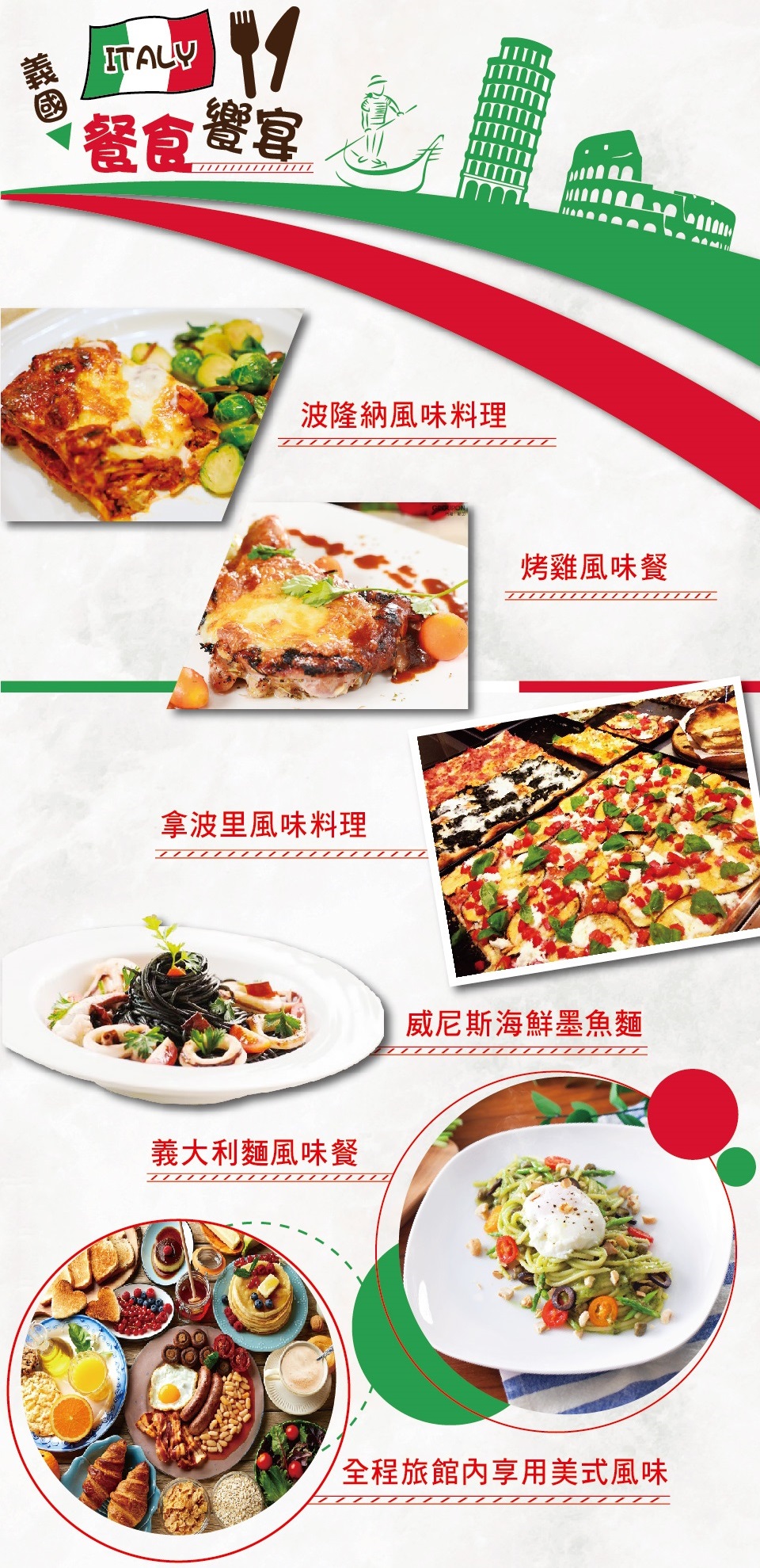 ★托斯卡尼莊園風味 ★波隆納風味料理 ★威尼斯海鮮墨魚麵風味餐 ★羅馬義大利麵風味餐