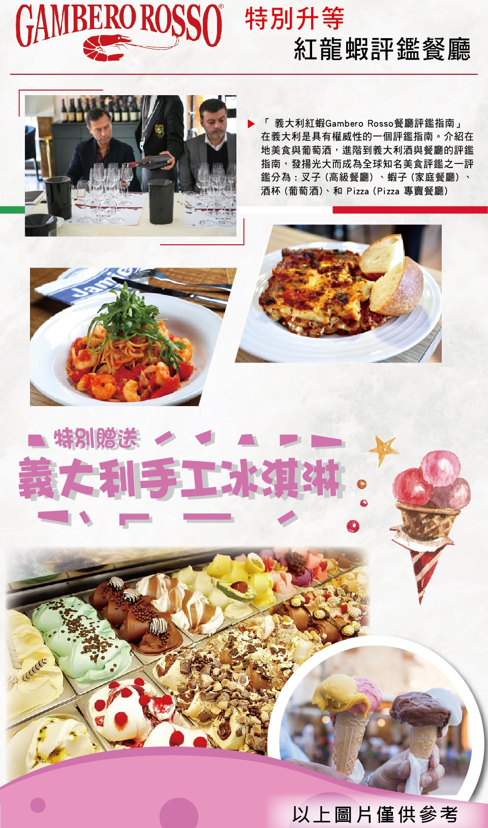 ★Gambero Rosso(紅龍蝦)義大利權威指南餐廳 ★全程旅館內享用美式早餐 ★全程中式料理六菜一湯
