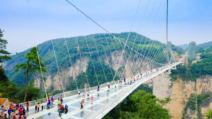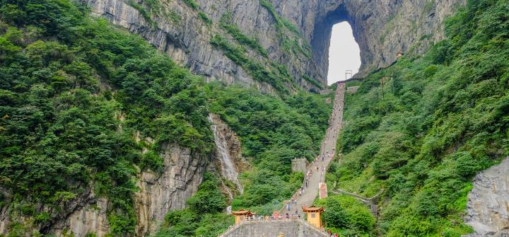鬼谷棧道是懸掛於峭壁中段的驚險步道,全長約1600公尺,海拔達1400公尺;最刺激的是60公尺長的玻璃棧道「天空之路」,腳下透明如鏡,彷彿行走空中,沿途可俯瞰壯麗山谷,挑戰膽量極限,絕對是張家界必訪的冒險景點。