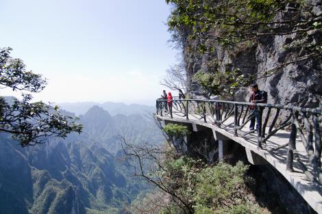天空步道位於天門山山頂東線,長255米,全線為實木結構。步道沿線不僅可觀99彎盤山公路全景,還是天門山翼裝飛行世錦賽空中賽道最佳觀看處。天門山西線玻璃棧道:長60米,寬1.6米,最高處海拔1430米,是國內首條玻璃棧道。