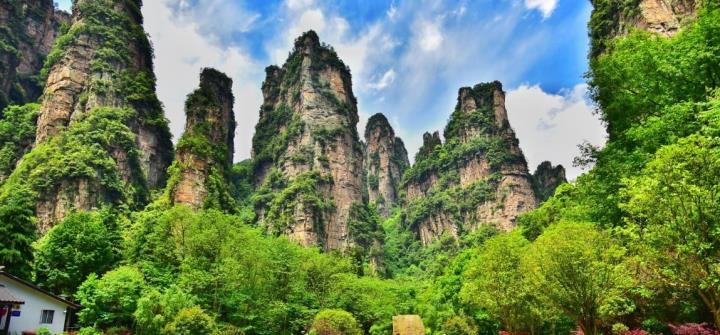 張家界十里畫廊景區,是該景區內的旅遊精華,有著豐富的自然景觀,人行其間如在畫中。溝旁黛峰屏列,山上的岩石形成了200來尊似人似物、似鳥似獸的石景造型,其中孔雀開屏、采藥老人、壽星迎賓、猛虎嘯天等最為著名。