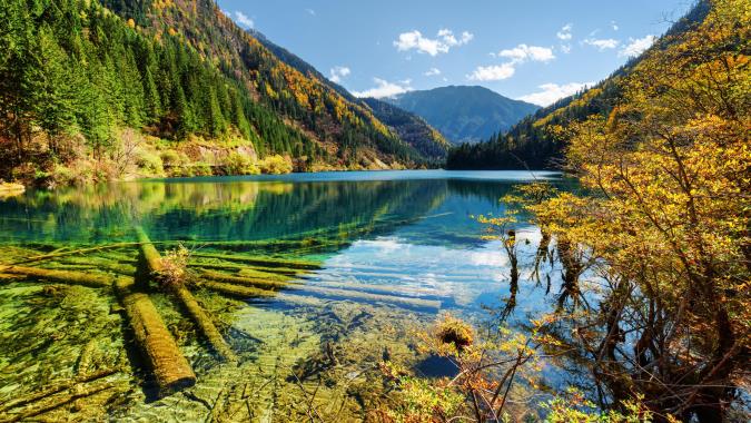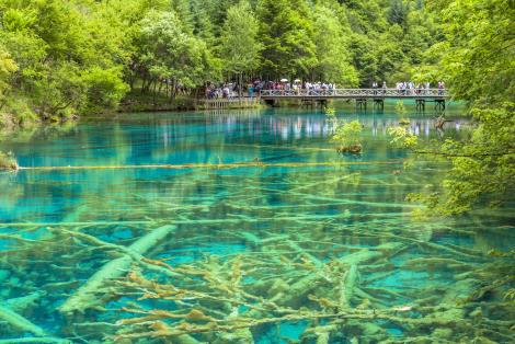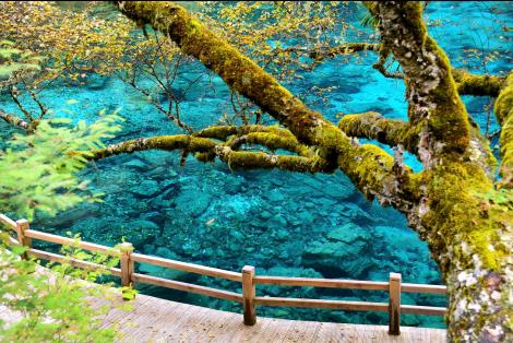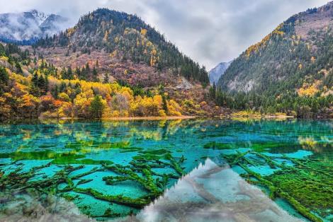 九寨溝之所以迷人,就在於其清澈見底的湖水隨著光影變化閃耀著各種七色炫彩。此地多達118個湖泊屬於高山階梯湖,湖水來自於雪山融雪,在經過不斷的石灰岩層透析後,再注入湖泊,水質澄淨,能見度高達30公尺,而這些飽含碳酸鈣的湖水,持續積覆在水中,日積月累加上湖中豐富的藻類植物,在陽光的照耀下,綻放出五彩繽紛的色澤。