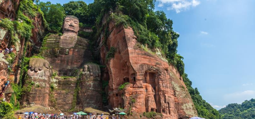 樂山大佛坐落在峨嵋山東麓,可俯瞰岷江、青衣江、大渡河交會奇景。高達71公尺的大佛以整座山岩雕鑿而成,大佛旁有一條僅容一人通過的陡峭階梯,走到最高處可看到大佛的臉部表情及線條,若來到大佛的肩膀的相對位置向下看,會發覺下方的人群小如螞蟻,而咱在十一公尺的腳背前向上仰望大佛時,不自覺為這如此巨大的佛像發出讚歎聲。