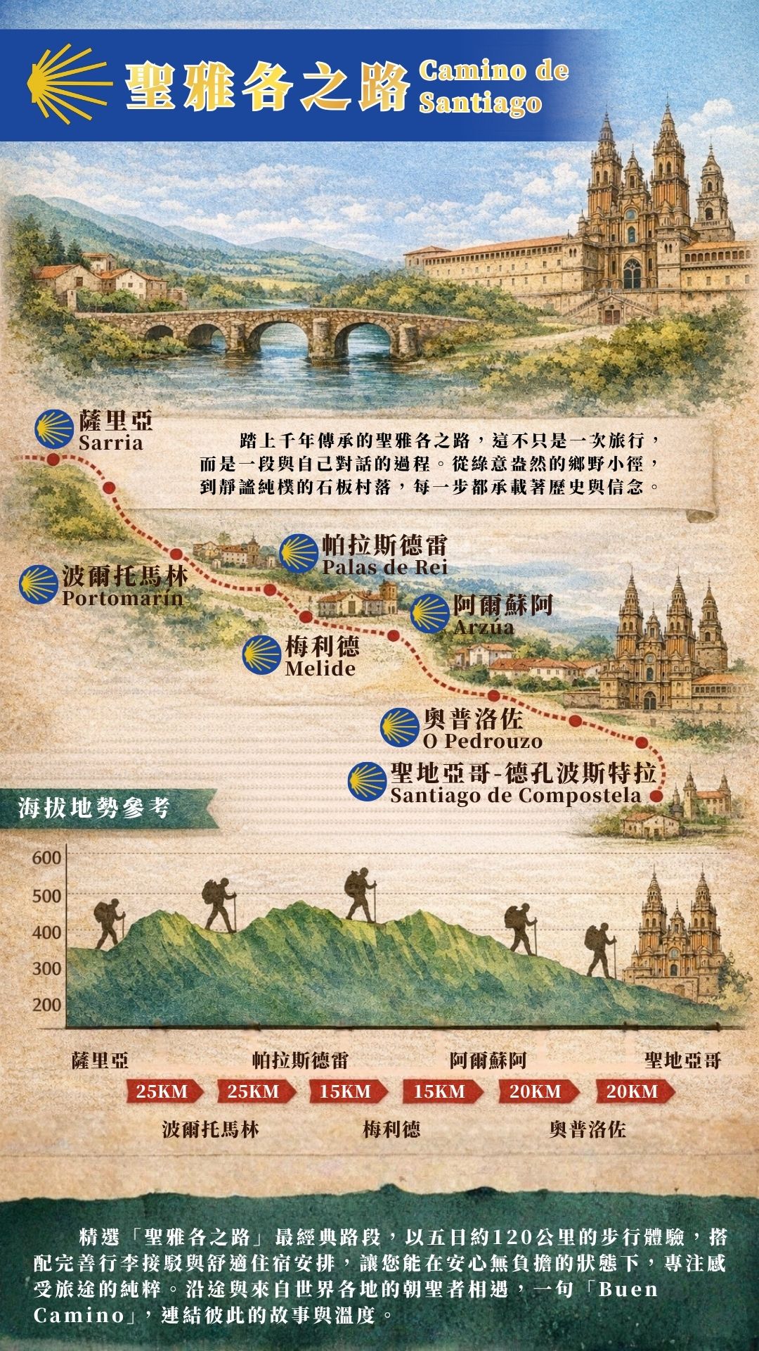 行程特別安排舒適住宿與完善後勤支援,讓您無需負重,也能安心前行;專業領隊隨行,細緻照顧每一段路程,無論是初次體驗或再次啟程,都能自在享受這段屬於自己的朝聖之旅。