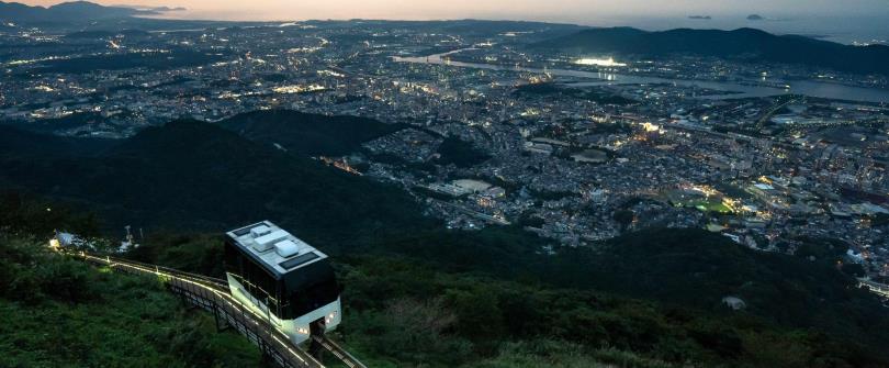 四面都裝設玻璃讓您在爬坡的同時也能一併觀望窗外的動人景色。抵達展望台站後於海拔約622公尺高的【皿倉山展望台】欣賞若戶大橋至洞海灣一帶、小倉到關門海峽與整個北九州的市區街景,將此美麗的風景全數收入眼底。