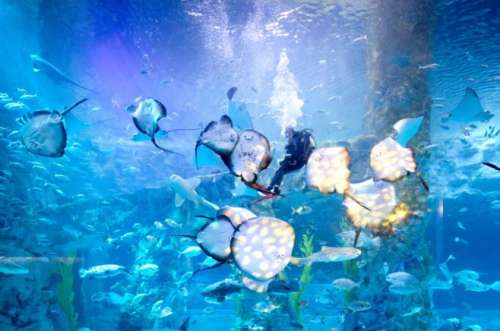 位於首爾蠶室的樂天世界水族館,為韓國第二大的水族館,總面積為11240平方米、水槽重達5200噸,養有650種不同種類的海洋生物。全館分為:韓國之河、亞馬遜河等13個主題,並設有長達85米的海底隧道猶如置身海底世界。除了欣賞海洋生物的優美泳姿,還可看到白鯨、海獅、企鵝和潛水員的表演,感受人類和自然共存的和諧。
