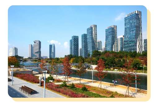 填海造成的人工島嶼松島,是都會的象徵。以松島的地標Tribowl表演場為中心,散布著一棟棟充分展現現代建築美學的建築,兒巖湖橫穿整座島的一側,湖周邊則規劃了良好的公園與道路。