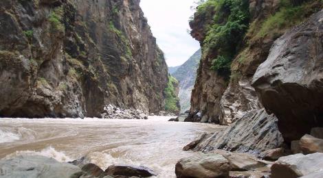 金沙江自石谷下行,江流平緩,距石谷30多公里與中甸來的碩多崗河匯合,過險灘、越斷崖、水從空墜,狂濤怒卷、玉屑騰空,奇險萬狀;江流最窄處僅約30餘米,相傳猛虎下山,在江中礁石稍一頓腳,便可騰空越過,故稱虎跳峽。
