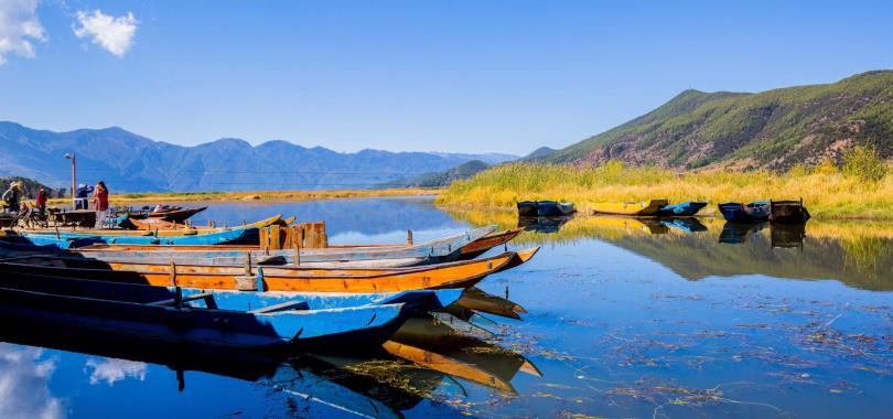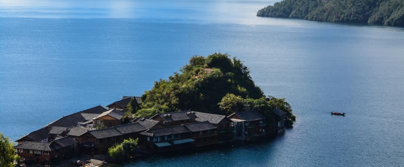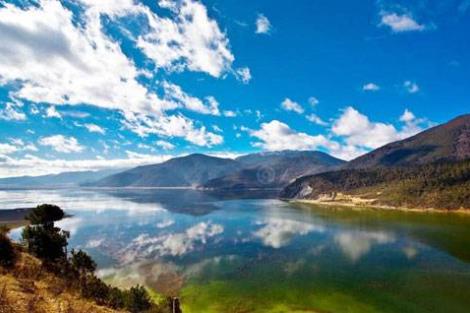 位於雲南寧蒗和四川鹽源兩縣交界,湖中有五個全島、三個半島,形態各異,青山環繞,山勢蜿蜒起伏,色彩碧翠,湖水清澈透明;緩緩滑行在碧波中的豬槽船和徐徐飄浮於天水之間的摩梭民歌,更添幾分古樸寧靜。