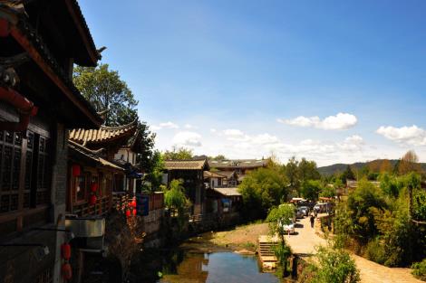 束河依山傍水、民居房舍錯落有致,街頭有一潭水,稱為九鼎龍潭、又稱龍泉,潭周綠柳垂地、翠柏指天,泉水清澈、游魚可數,潭中溢出的流水蜿蜒於村中道旁;街面上的那些被人馬踩踏得光溜平滑的石板,似乎還能照見往日的繁華。