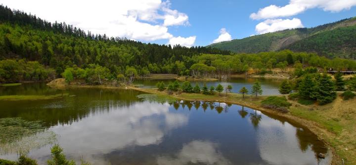 屬都湖湖水清澈,水底小魚悠遊。最獨特的是一種名為「裂腹魚」的珍稀魚類,這種魚腹部有一條細細的裂紋,魚肉細膩鮮美。湖四周是遮天蔽日的林木,湖畔還有個牛羊成群的牧場,充滿藏區的生活情趣。