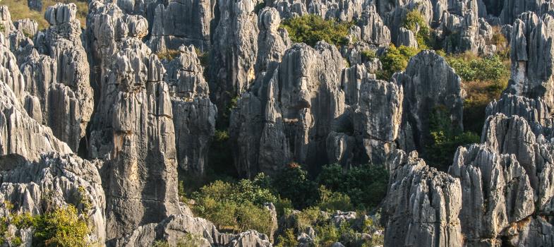 石林風景區由巨厚的岩層構成,其岩峰猶如密布的林木,拔地而起,直刺天際,遠望如一片莽莽森林,因而得名。園中包括大、小石林,無數的石徑、石廊、石門、石洞、石橋,貫串其間,數不清的崎嶇石峰和高聳峭壁,氣勢磅薄開闊。