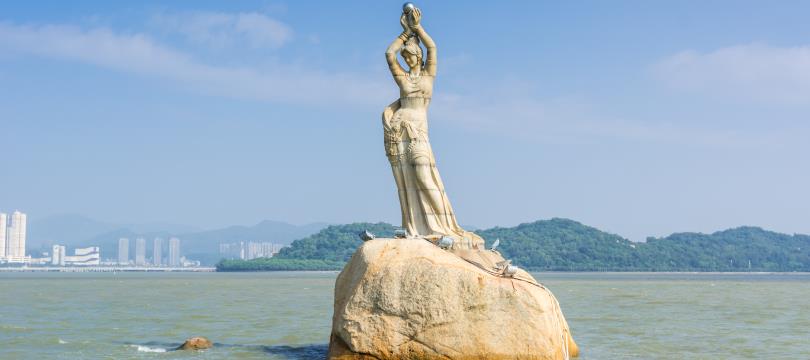 漁女是珠海的標誌性雕塑,這座雕塑高達約9米,由花崗岩雕刻而成,形象是一位美麗的漁女手捧珍珠,象徵著珠海的名字和漁業傳統。珠海漁女不僅是城市的象徵,也吸引了眾多遊客前來觀光和拍照,成為當地的重要地標和旅遊景點。