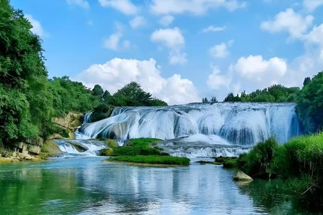 電視劇《西遊記》的取景地。黃果樹大瀑布因本地廣泛分佈著黃葛榕而得名,是世界著名大瀑布之一,以水勢浩大著稱。瀑布高度為77.8米,寬101米,屬喀斯特地貌中的侵蝕裂典型瀑布,鋪展在整個岩壁上,不失其闊而大的氣勢。
