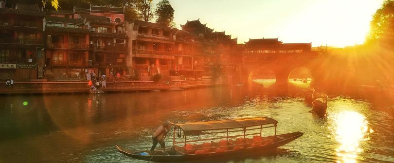 鳳凰古城最迷人的體驗之一,乘船上欣賞古城景色,沱江穿城而過,江水清澈見底,沿江兩岸是極具湘西民族特色、百年歷史的吊腳樓,乘船緩緩穿梭於燈火輝映的吊腳樓與古橋之間,欣賞江岸夜色與倒影交織的詩意畫面。
