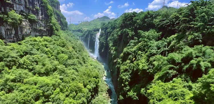 馬嶺河峽谷是一條在造山運動中剖削深切的大裂水地縫,湍急河水和地下將地表切開的一條裂谷,由上往下看是一道地縫,由下往上看是一線天溝。谷內群瀑飛流,翠竹倒掛,溶洞相連,兩岸古樹名木點綴其間,千姿百態。