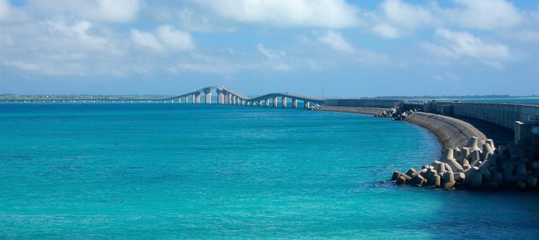 伊良部大橋開通於2015年1月,連接宮古島與伊良部島,全長3,540公尺,諧音象徵「珊瑚島」。這條日本最長的免通行費大橋貫穿碧海藍天,海景壯麗,被譽為東洋最美兜風路線,幸運時還能望見海龜悠游。