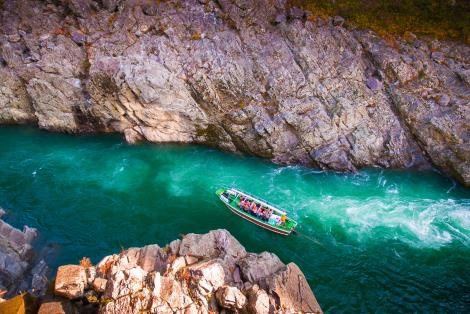經過吉野川2億年的侵蝕而形成的《大步危峽谷》,有著高聳斷崖及岩壁怪石,是古往今來跋涉艱難的地段。春櫻、夏綠、秋楓,搭乘觀光遊覽船巡遊,除了可以欣賞峽谷季節之美,還能近距離觀賞天然紀念物「含礫片岩」呢!
