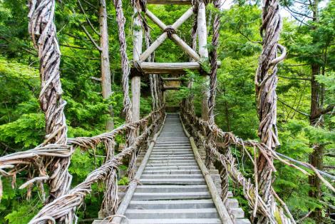因翡翠綠的《祖谷溪》流經而切割出深V型的峽谷,架設在溪川之上的《葛藤橋》約三層樓高,利用奇異果的藤蔓架設而成,長45公尺、寬2公尺、重約5頓,是日本三大奇橋之一,來到這裡就試試走上這座橋挑戰自己的膽量吧!
