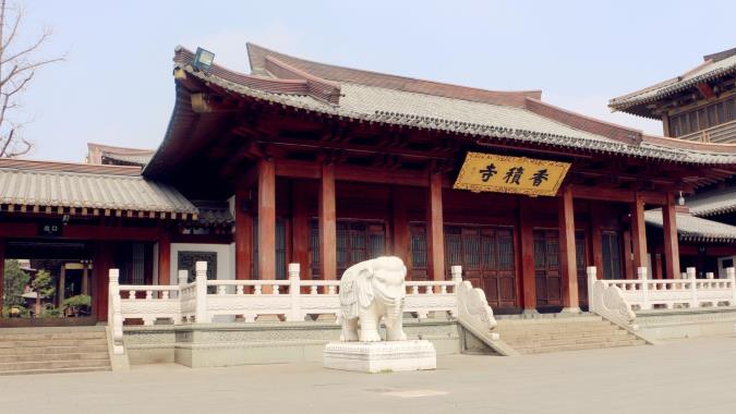 千百年間,歷盡風霜,幾經劫難。現今的香積寺,煥然一新,從南至北,依次為漢白玉的石牌坊,精工細作,氣勢宏偉,正中書「香積古剎」,後書「淨土祖庭」;底座分置石雕青獅、白象、金毛吼,三種靈瑞奇獸,各具形態令人讚歎。