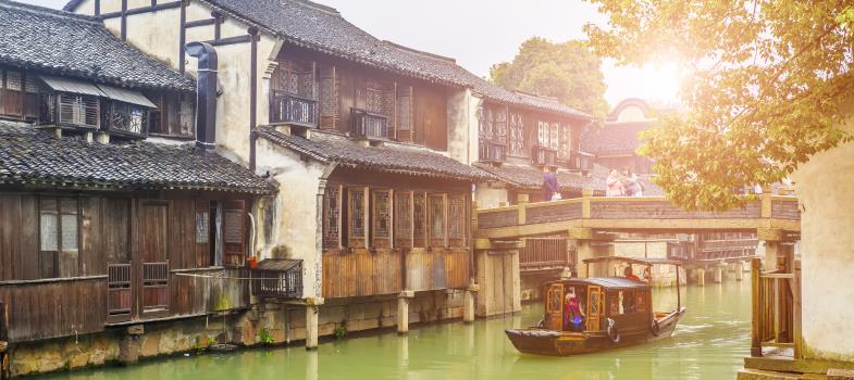 烏鎮,毗鄰古老的京杭大運河畔,由十二個碧水環繞的島嶼組成,需坐渡船進入。景區內保存有精美的明清建築,古石橋72座,河流密度和石橋數量均為全國古鎮之最。烏鎮西柵真正呈現了原汁原味的江南水鄉古鎮的歷史風貌。